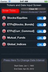 - Tickers are the only item you type in the App - they are in standard US format and can be looked up on the web (such as Yahoo! Finance) by entering partial company/issuer names. After you have a couple of tickers in mind, say SPY and IEF enter them in the 'Red' ticker-entry box (use a space or a comma between the tickers) and swipe left - that's it! You will see a chart with two lines and a table below with total returns for the default 1 year period. This particular case is for the US Stock market versus US Treasury Bonds. Now you can make it interesting: swipe back, enter SPY, IEF again, tap the 'Date Picker' and select a 5 year window (remember to hit the 'save begin date' button) and tap 'Done' - now you see two lines with a wider dispersion. But wait, I entered 4 tickers? OK, swipe back and turn OFF a pair of SPY and IEF, then swipe left. Now you see 4 lines, the spread between each line is the 'invisible' income portion of total return. Notice the large difference in the associated table for IEF. Also notice how IEF has been a slow and steady return generator, with almost half of its returns coming from coupon interest. Financial assets such as bonds, convertibles and high dividend stocks, ETFs and mutual funds appear visually unattractive on websites that provide price only return charts. The 'optical bias' can lead to actual wealth loss, if a potential investor forgoes such investment opportunities in favor of typically higher volatility assets.