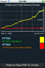 Noticing the increasing appearance of this matter in the professional and social finance circles, we decided to produce an actionable solution. A team comprising of quantitative computational finance and mobile computing specialists from the US, Germany and Canada created this finance App. With the old desktop morphing into the mobile gadget we decided to create an iPhone App that would allow the serious investor and the newer generation of investors to plot Total return charts and have instant cumulative total returns, which include both dividends and coupon interest. As of 2018, we hope to have an Android / Desktop version too.
