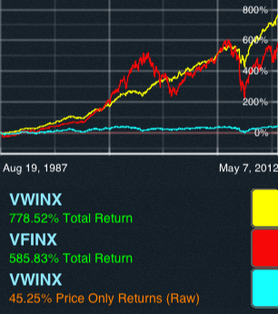 >> Try VWINX, VFINX with start date 1987, notice the about 200% difference? This is also an example of how balanced income funds can add steady value over time, the Vanguard VWINX fund has an asset allocation of about 65% US Bonds and 35% Equity. Notice the lower volatility of the 'yellow' line, that is the income fund and the difference is not minuscule. If you add VWINX one more time and turn dividends OFF, the third flat 'blue' line will make for a very uninteresting low volatility investment. But that is not the case. This App changes that.