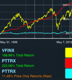 >> Try VFINX, PTTRX, PTTRX with start date 1987, and turn OFF the button for the second PTTRX, notice the huge 200%+ difference!? This is also an illustration of how bond funds can add steady value over time. The flat ‘blue’ line and the nice ‘red’ line are the SAME asset (in this case PIMCO’s Total Return fund), would you invest in the ‘blue’ asset if that and the 'yellow' lines are all you saw after 16 years? But that is what is seen on most sites that have ‘price only’ returns, naturally it disinterests most investors (seeing a mere 11% vs the invisible actual 223%). Note: the graph date auto-defaults to 1996, since that is the earliest history on PTTRX. - ***A list of tickers I could plug in to start exploring?
