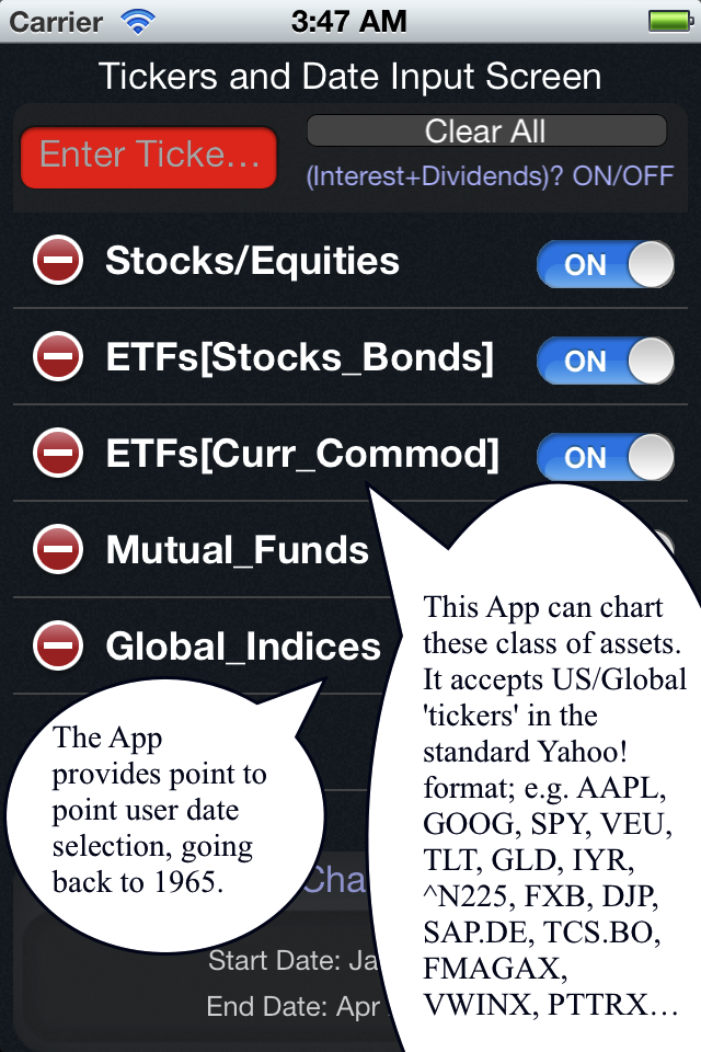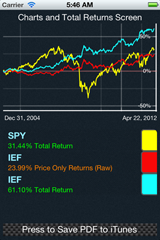 - Tickers are the only item you type in the App - they are in standard US format and can be looked up on the web (such as Yahoo! Finance) by entering partial company/issuer names. After you have a couple of tickers in mind, say SPY and IEF enter them in the 'Red' ticker-entry box (use a space or a comma between the tickers) and swipe left - that's it! You will see a chart with two lines and a table below with total returns for the default 1 year period. This particular case is for the US Stock market versus US Treasury Bonds. Now you can make it interesting: swipe back, enter SPY, IEF again, tap the 'Date Picker' and select a 5 year window (remember to hit the 'save begin date' button) and tap 'Done' - now you see two lines with a wider dispersion. But wait, I entered 4 tickers? OK, swipe back and turn OFF a pair of SPY and IEF, then swipe left. Now you see 4 lines, the spread between each line is the 'invisible' income portion of total return. Notice the large difference in the associated table for IEF. Also notice how IEF has been a slow and steady return generator, with almost half of its returns coming from coupon interest. Financial assets such as bonds, convertibles and high dividend stocks, ETFs and mutual funds appear visually unattractive on websites that provide price only return charts. The 'optical bias' can lead to actual wealth loss, if a potential investor forgoes such investment opportunities in favor of typically higher volatility assets.