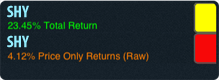 >> Try SHY, SHY with a 10 year date interval, and turn OFF the button for the second SHY, notice the 25%+ difference? It is the same short duration US Treasury bond ETF that with almost no volatility has produced a 25% return (and state tax shielded, since it is a US Treasury bond vehicle). BTW, use 'clear all' to clear all tickers from the previous run. Note: The idea is that you try these four examples out yourselves, the small images serve only as a reference to compare your output.
