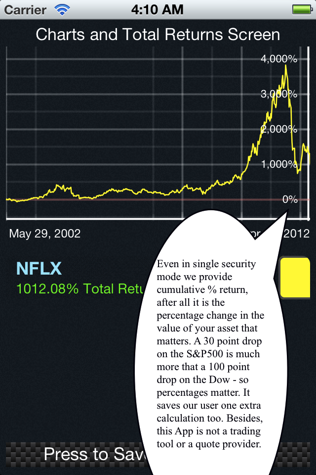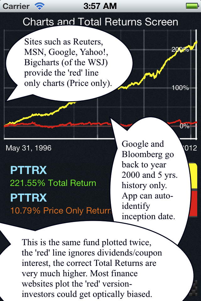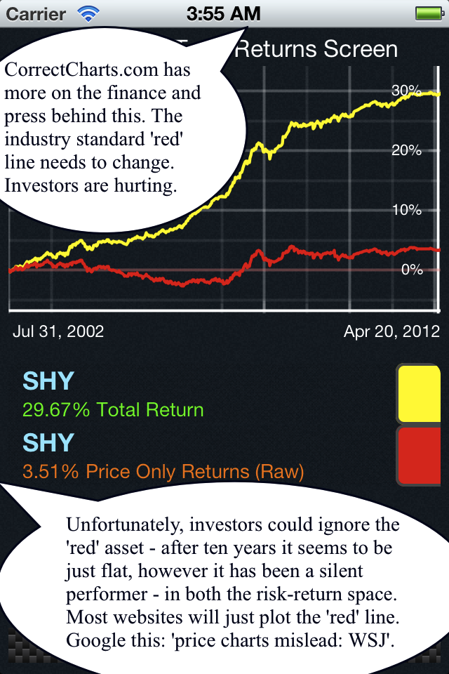 Noticing the increasing appearance of this matter in the professional and social finance circles, we decided to produce an actionable solution. A team comprising of quantitative computational finance and mobile computing specialists from the US, Germany and Canada created this finance App. With the old desktop morphing into the mobile gadget we decided to create an iPhone App that would allow the serious investor and the newer generation of investors to plot Total return charts and have instant cumulative total returns, which include both dividends and coupon interest. As of 2018, we hope to have an Android / Desktop version too.